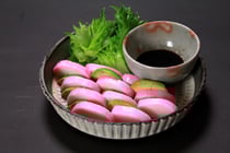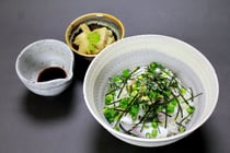 薬味であるみょうが・生姜・青ネギが、お酢のさっぱりした味をさらに引き立たせます。お好みの醤油をかけてお召し上がりください。