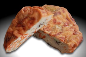 彩よくグリーンピース・コーン・イカ・人参を中に入れて、白魚のすり身にそれとは違う食感のすり身を2重に巻いています。